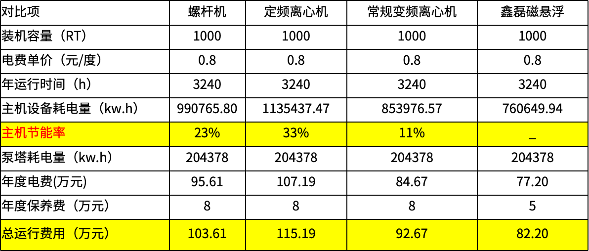 某工業(yè)廠房面積20000㎡,設(shè)計負(fù)荷為3517kw(1000RT),分別對螺桿機、定頻離心機、常規(guī)變頻離心機、磁懸浮離心機進(jìn)行綜合能效測算,每年270天,每天12小時,電費按照0.8元/度進(jìn)行核算,分別對節(jié)能量和運行費用對比,磁懸浮主機節(jié)能效果最佳,每年主機最高可節(jié)省費用32萬+。
