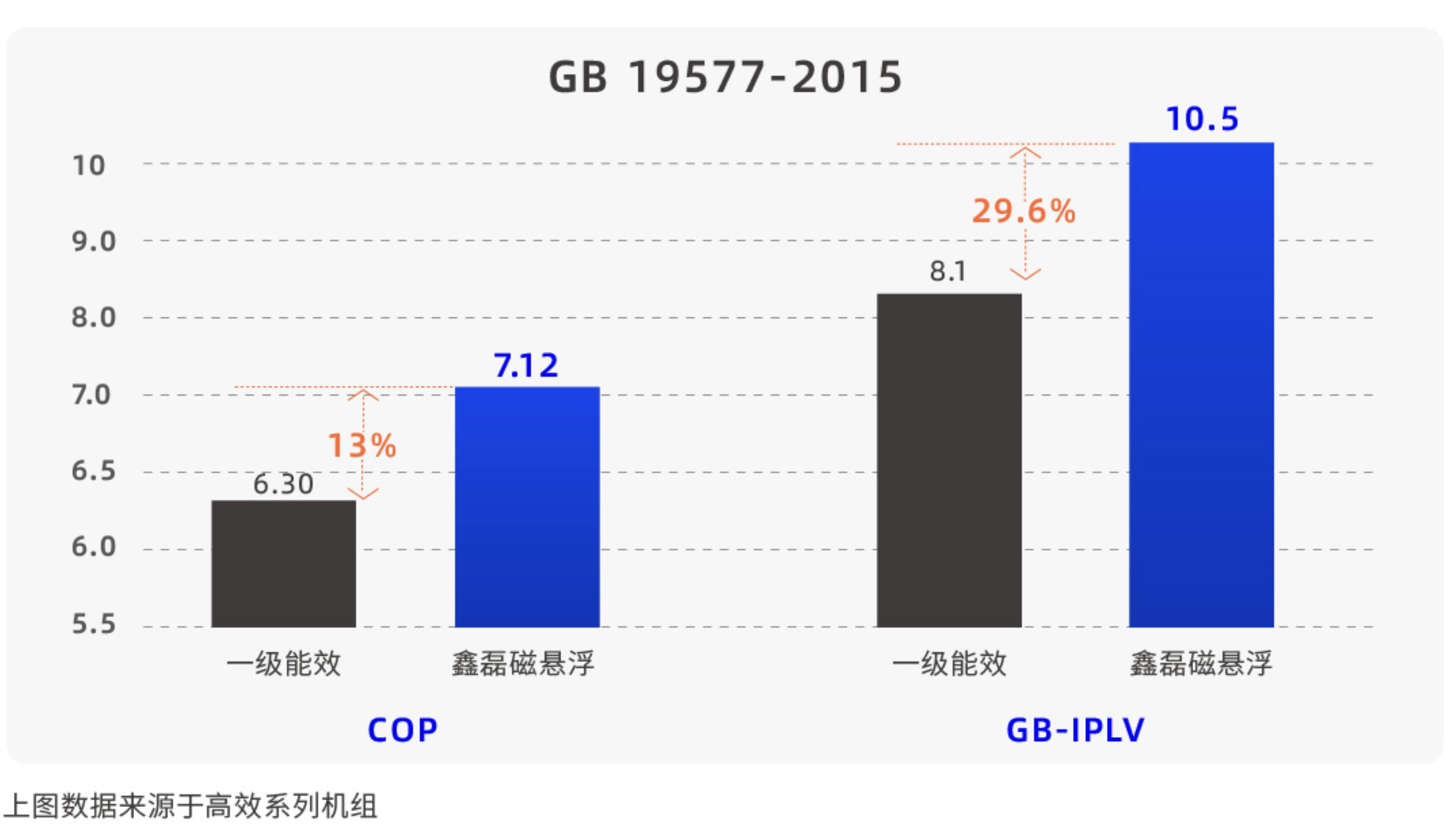 鑫磊磁懸浮變頻離心式冷水(熱泵)機組COP高達(dá)7.12,遠(yuǎn)超一級能效13%;GB-IPLV高達(dá)10.5,遠(yuǎn)超一級能效29.6%。