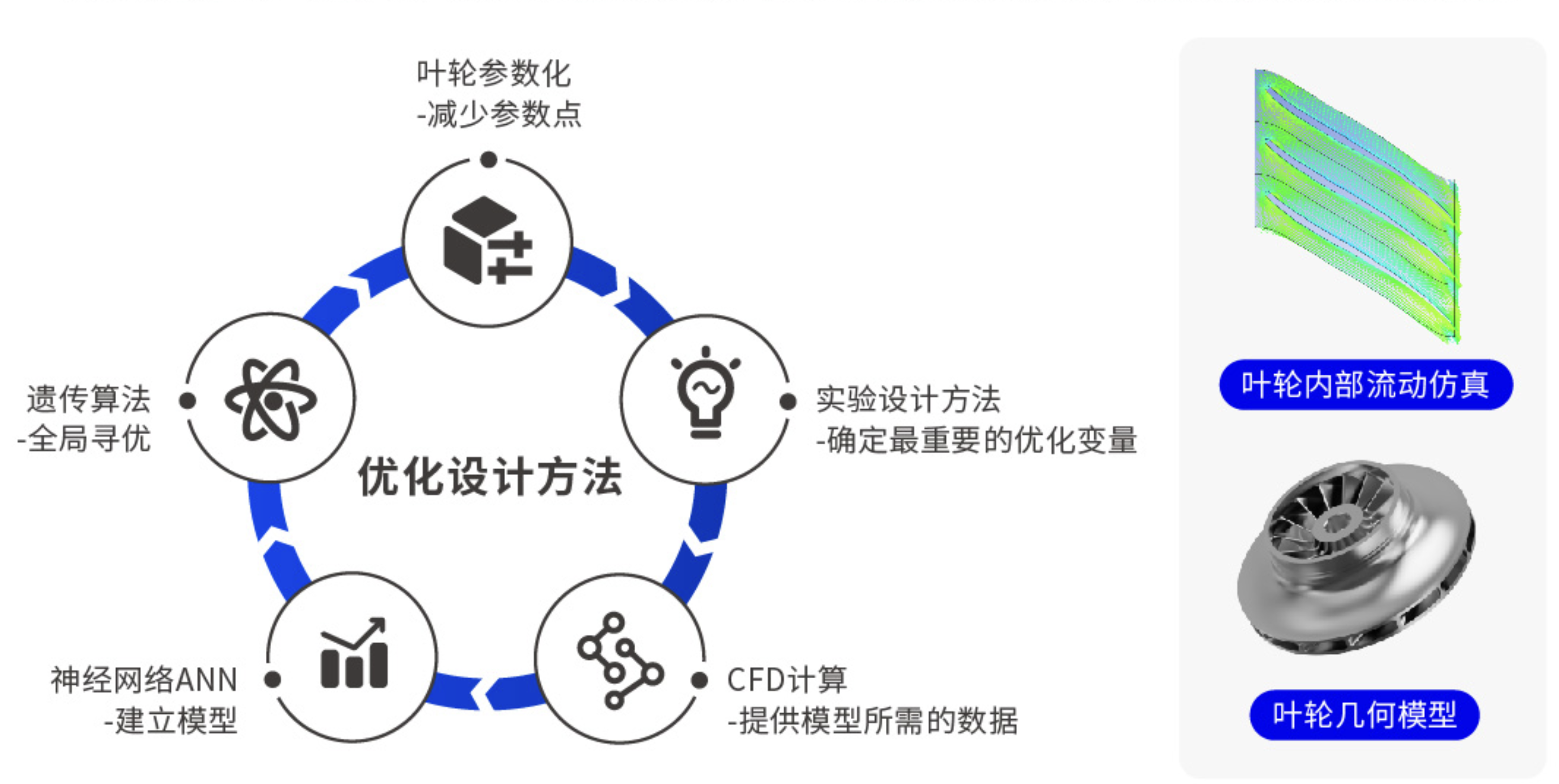 葉輪采用CFD計算+神經(jīng)網(wǎng)絡(luò)+遺傳算法的優(yōu)化技術(shù),進(jìn)行寬工況參數(shù)優(yōu)化設(shè)計,實現(xiàn)額定和部分負(fù)荷雙高效。